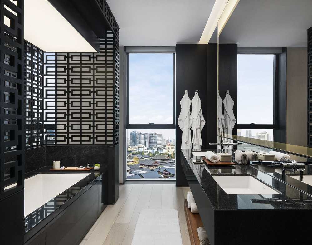 (1)在酒店的房間配置等,客房有100余間以及42間服務式住宅,房間多數采用手工家具、木質屏風等,中式古典的風格在適當的融入現代的設計技巧,使其酒店的價值完美的體現。