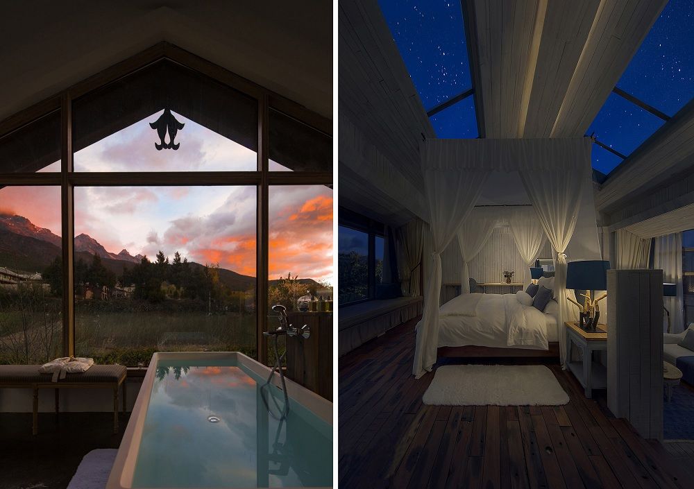 坐在室內拿開窗簾一幅絕美長篇的畫卷盡收眼底,幾乎每個房間窗外都被田野、雪山和森林包圍。房子四面開窗,更大限度使用自然光、自然風,節省能源。屋頂有自動天窗,躺在床上就可以欣賞玉龍雪山的美景與夜晚的滿天繁星。幾乎360度任何一個角度都不能被浪費,每每都是幽景。